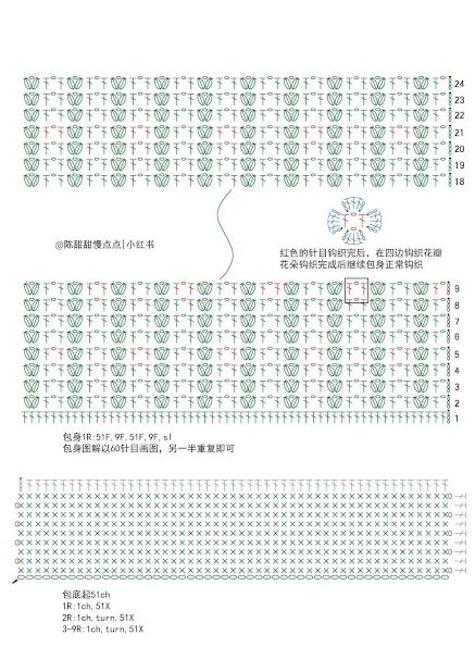 Chart móc đáy và thân túi: hoa móc vào họa tiết ô lưới trên thân túi (sau khi vừa móc xong ô)